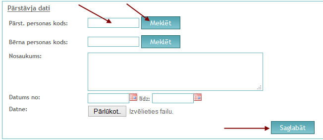 "Pārst. personas kods" - vecāka personas kods (obligāts);