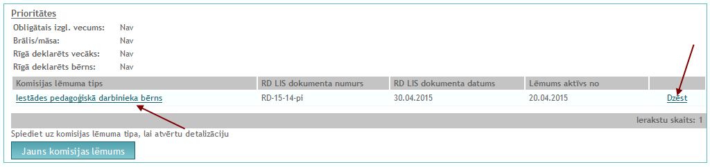 Nospiežot uz komisijas lēmuma tipa nosaukuma hipersaites, tiek atvērta tā detalizācija.