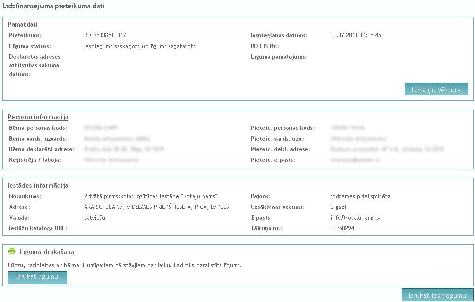 Atverot līdzfinansējuma pieteikuma ar statusu "Apstiprināts" detaļas, lietotājs var apskatīt tā izmaiņu vēsturi, nospiežot pogu "Izmaiņu vēsture", izdrukāt līgumu, nospiežot pogu "Drukāt līgumu" vai iesniegumu, nospiežot pogu "Drukāt iesniegumu".