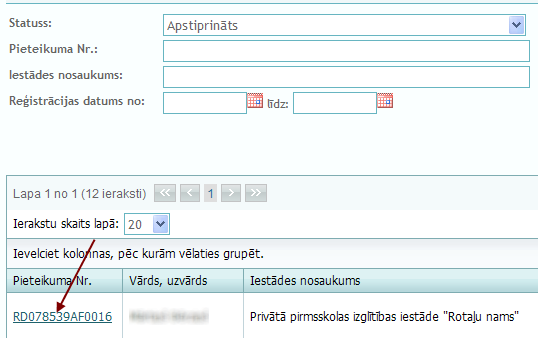 Kad līgums ir noslēgts, pieteikumam pie teksta "Līguma Nr.:" automātiski tiek piešķirts Līguma numurs.
