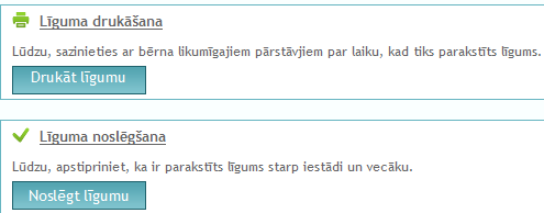 Lai pieteikumam piešķirtu statusu "Noslēgts", jānospiež poga "Noslēgt līgumu". Pēc tam attēlotajā paziņojuma logā, lai apstiprinātu darbību, jānospiež poga "Turpināt". Lai atceltu līguma noslēgšanu, jānospiež poga "Atcelt".