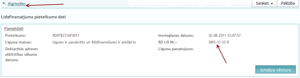 Lai atgrieztos logā "Līdzfinansējuma uz līguma pamata pieteikumu saraksts", jānospiež hipersaite "Atgriezties".