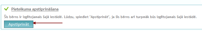 Lai apstiprinātu, ka iesniegums ir saskaņots par līdzfinansējuma piešķiršanu, jānospiež poga "Apstiprināt". Attēlotajā paziņojuma logā, lai apstiprinātu darbību, jānospiež poga "Turpināt". Ja vēlas atcelt pieteikuma apstiprināšanu, jānospiež poga "Atcelt".
