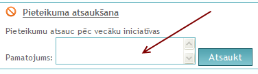 Sadaļā "Pieteikuma atsaukšana" laukā "Pamatojums" jāievada pieteikuma atsaukšanas pamatojums. Pēc tam jānospiež poga "Atsaukt", un attēlotajā paziņojuma logā, lai apstiprinātu darbību, jānospiež poga "Turpināt". Lai atceltu pieteikuma atsaukšanas darbību, jānospiež poga "Atcelt".
