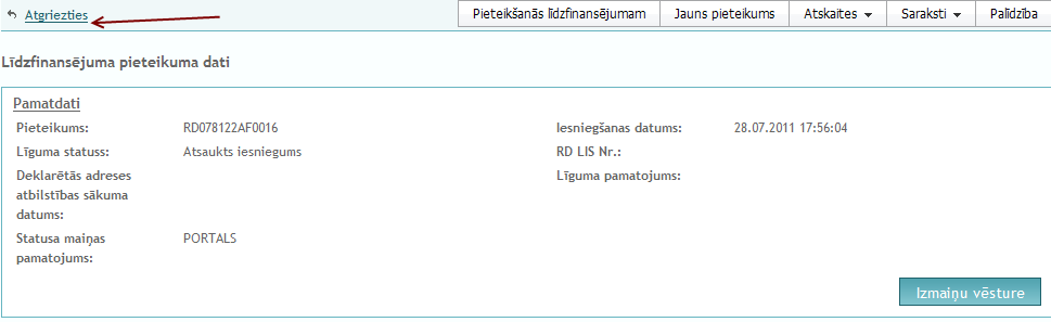 Pēc pieteikuma atsaukšanas, pie teksta "Statusa maiņas pamatojums" tiks attēlots ievadītais pamatojums un pie teksta " Līguma statuss" - Atsaukts iesniegums.
