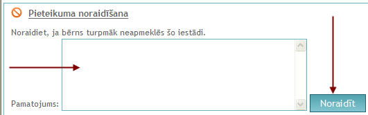 Lai noraidītu pieteikumu, jāievada laukā "Pamatojums" pieteikuma noraidīšanas pamatojums, pēc tam jānospiež poga "Noraidīt". Attēlotajā paziņojuma logā, lai apstiprinātu darbību, jānospiež poga "Turpināt".