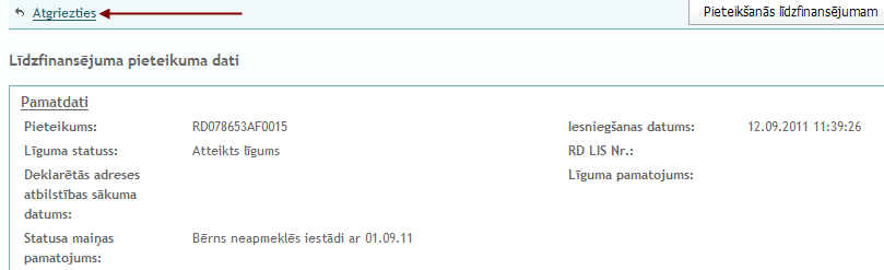 Lai atgrieztos logā "Līdzfinansējuma pieteikumu saraksts", jānospiež hipersaite "Atgriezties".