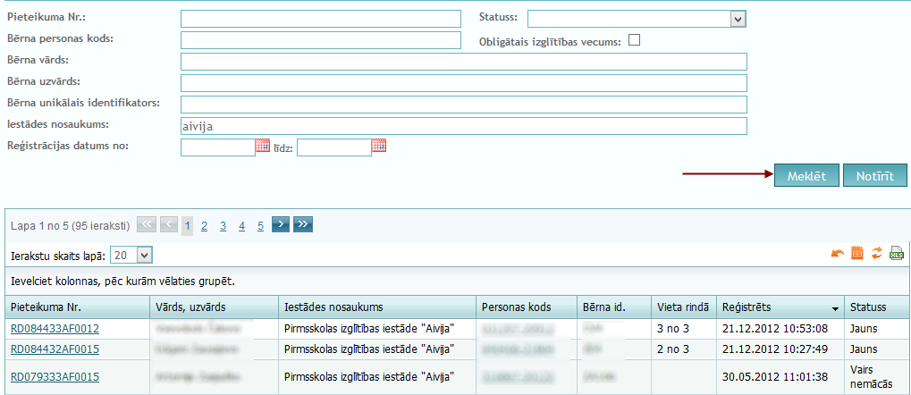 Atverot sadaļu "Pieteikumu saraksts", tiek atvērta lapa ar meklēšanas iespēju.
